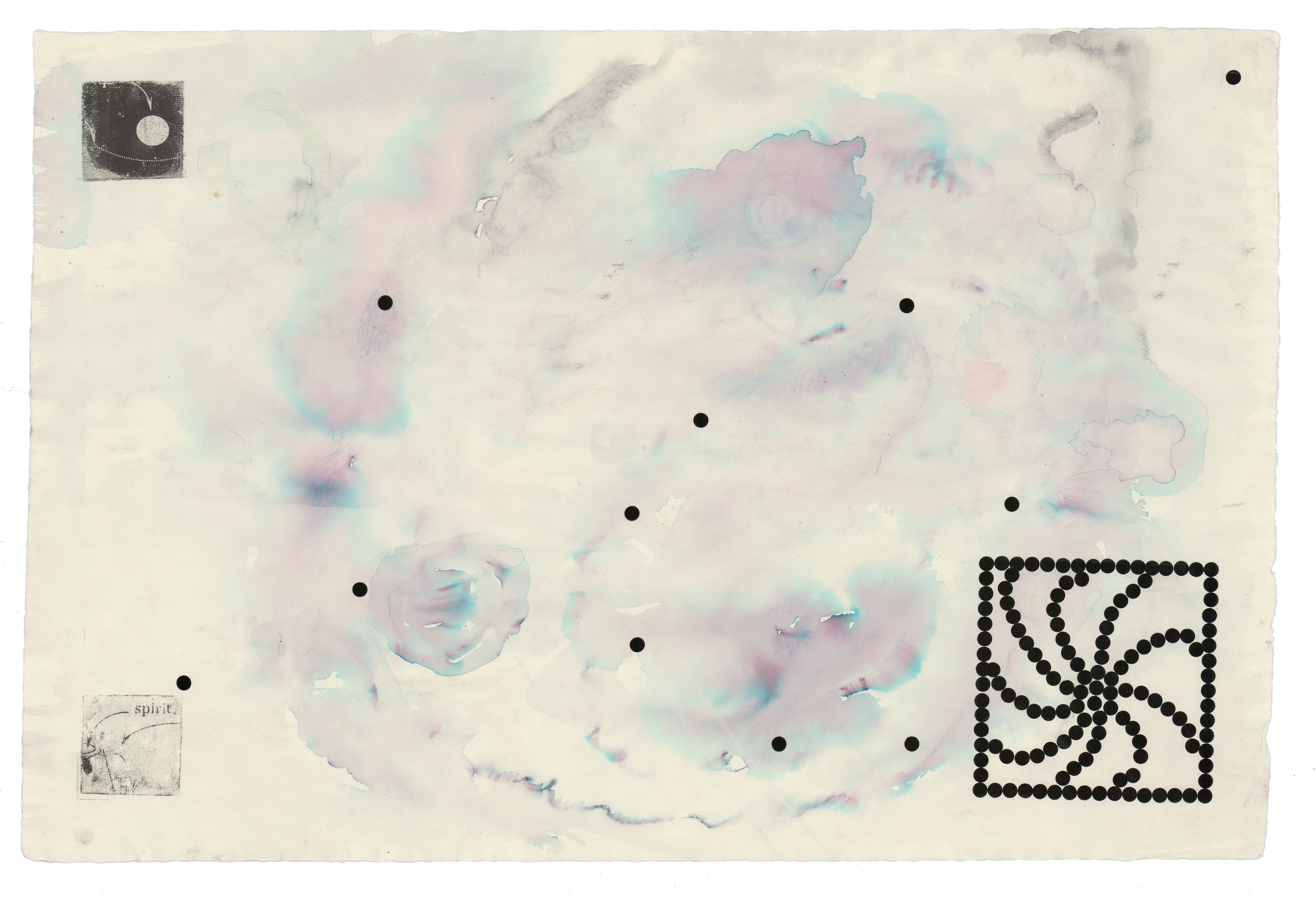 monoprints on cotton rag paper and found paper with diluted corrections ink, water activated pigment crystals
