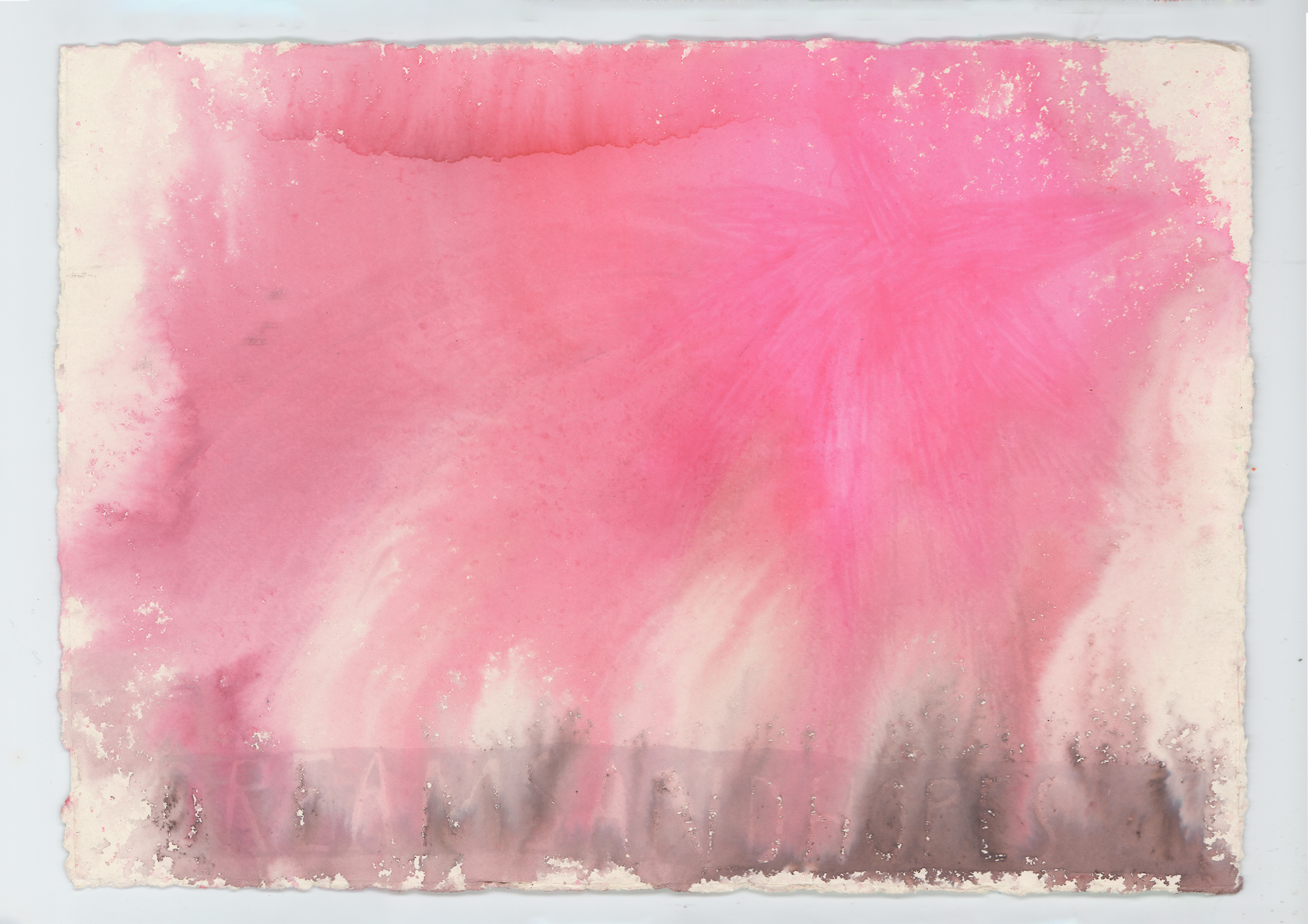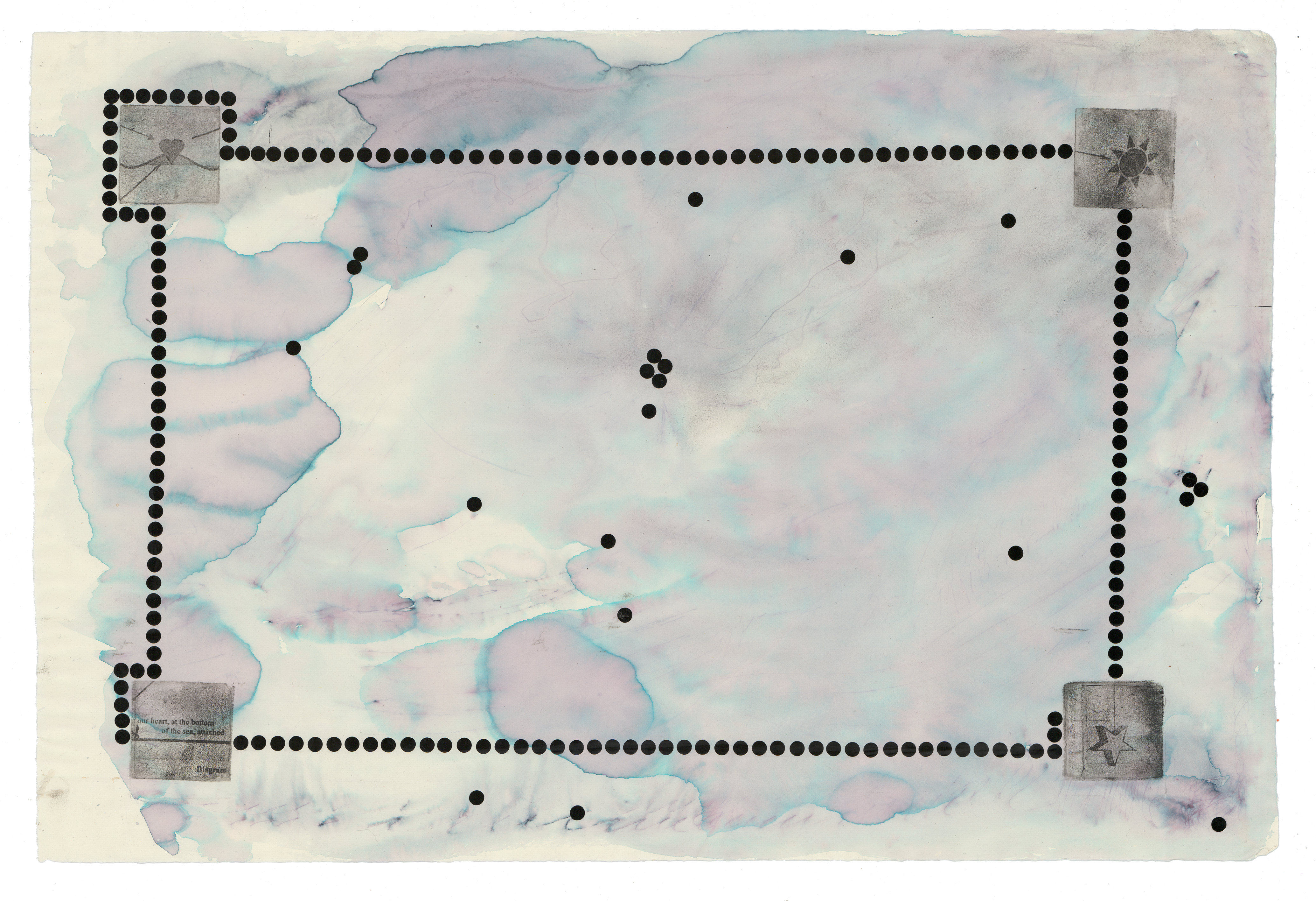 monoprint on watercoloured notebook paper, magnets, star cut semi precious stone, rose quarz, pencil, found plastic objects, plastic coin