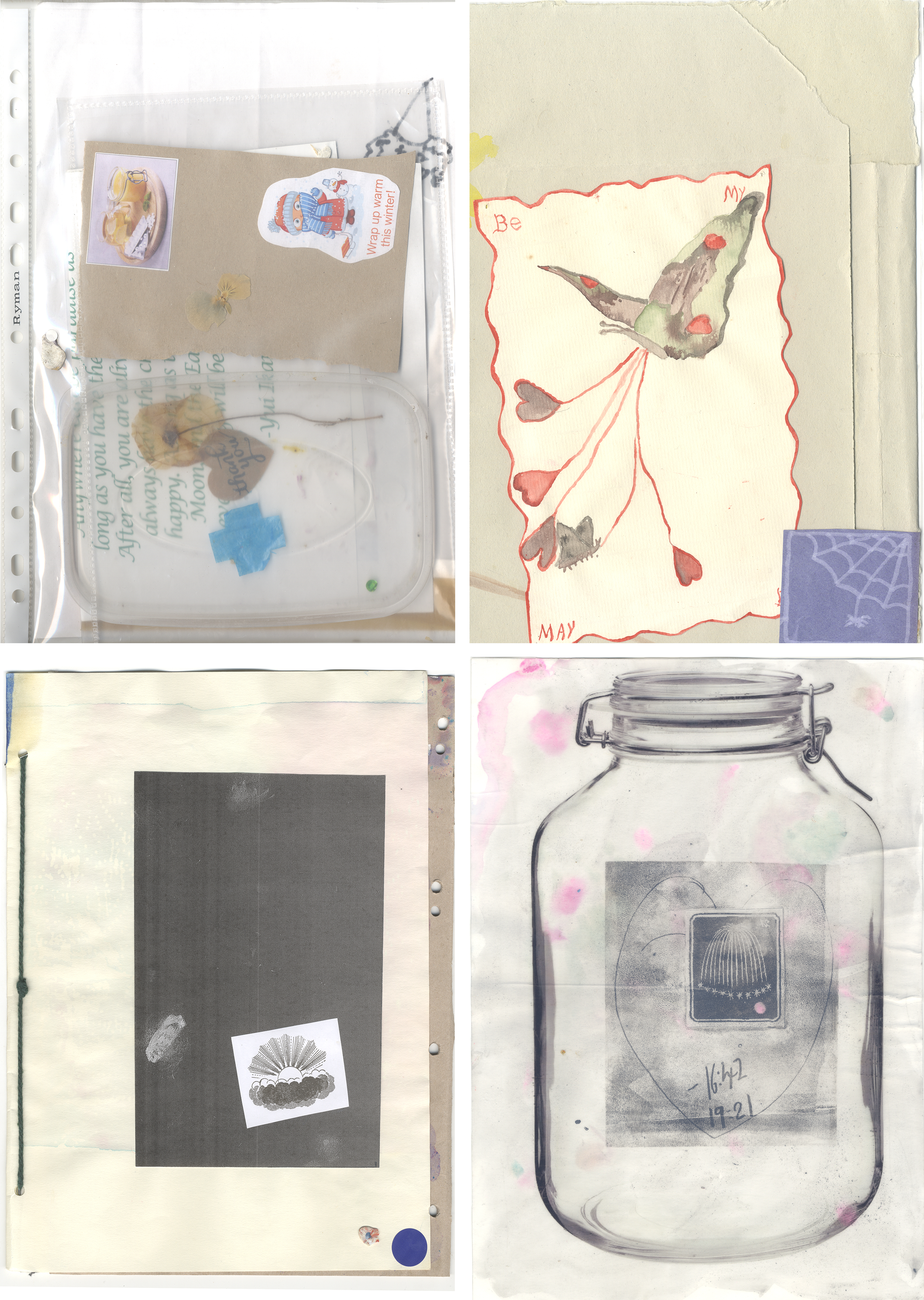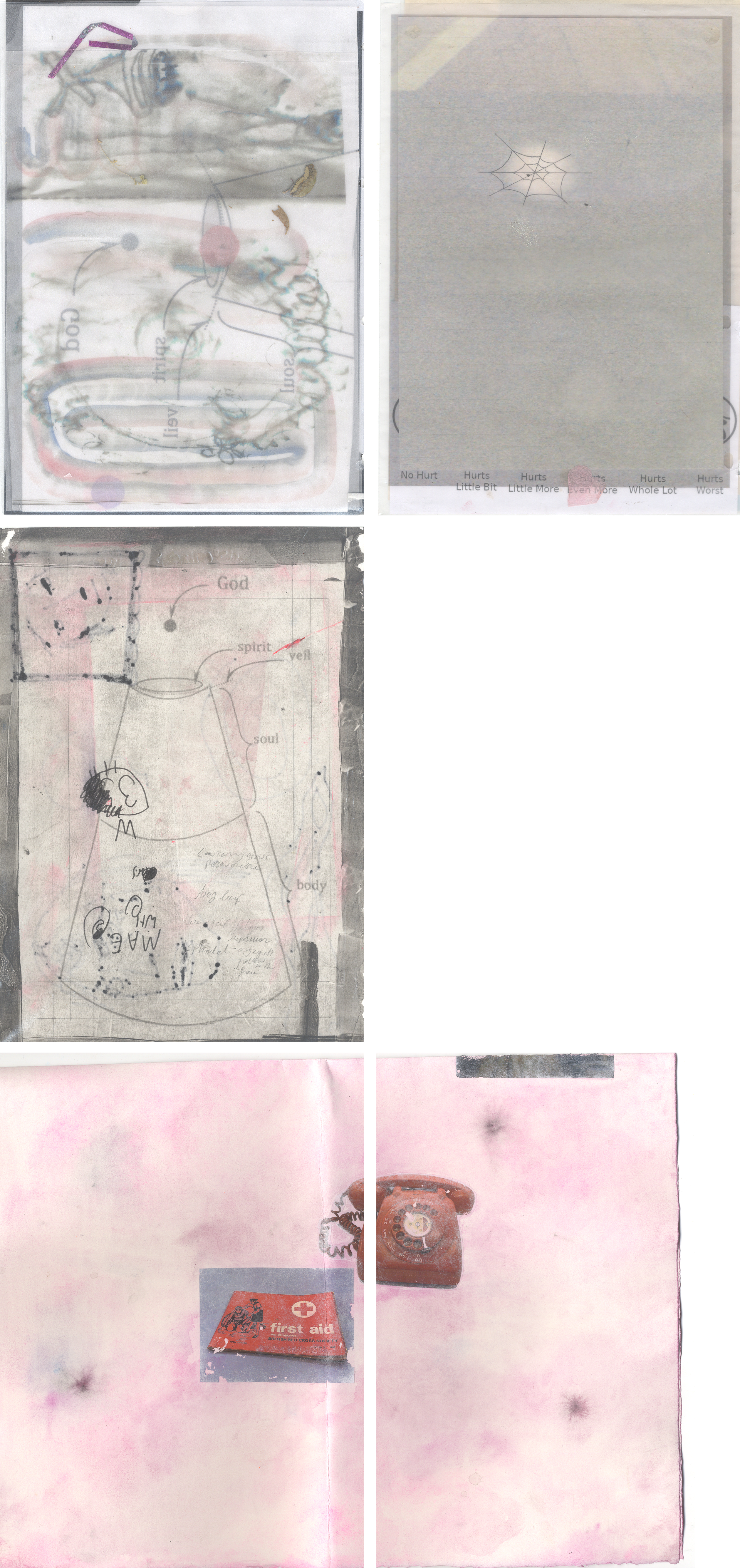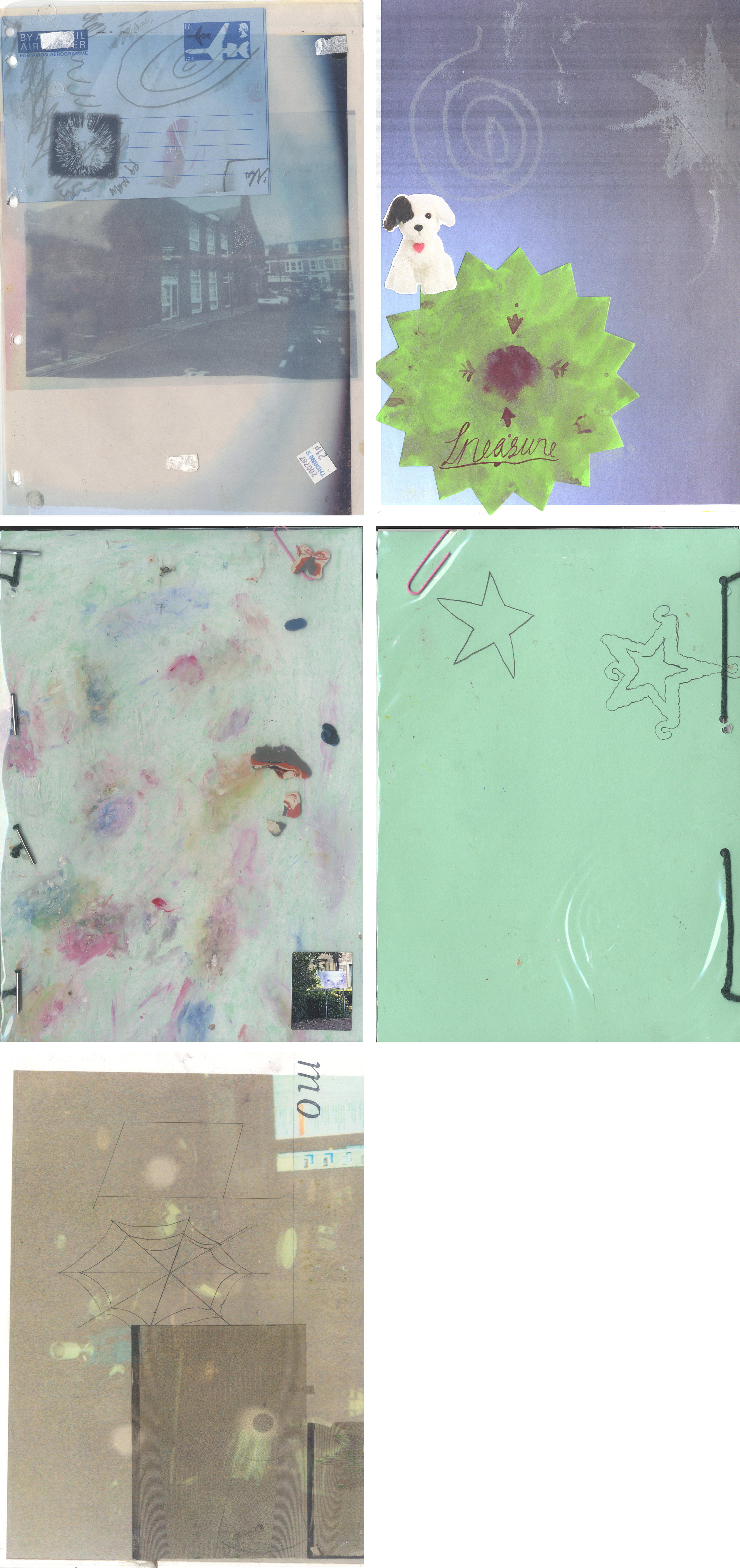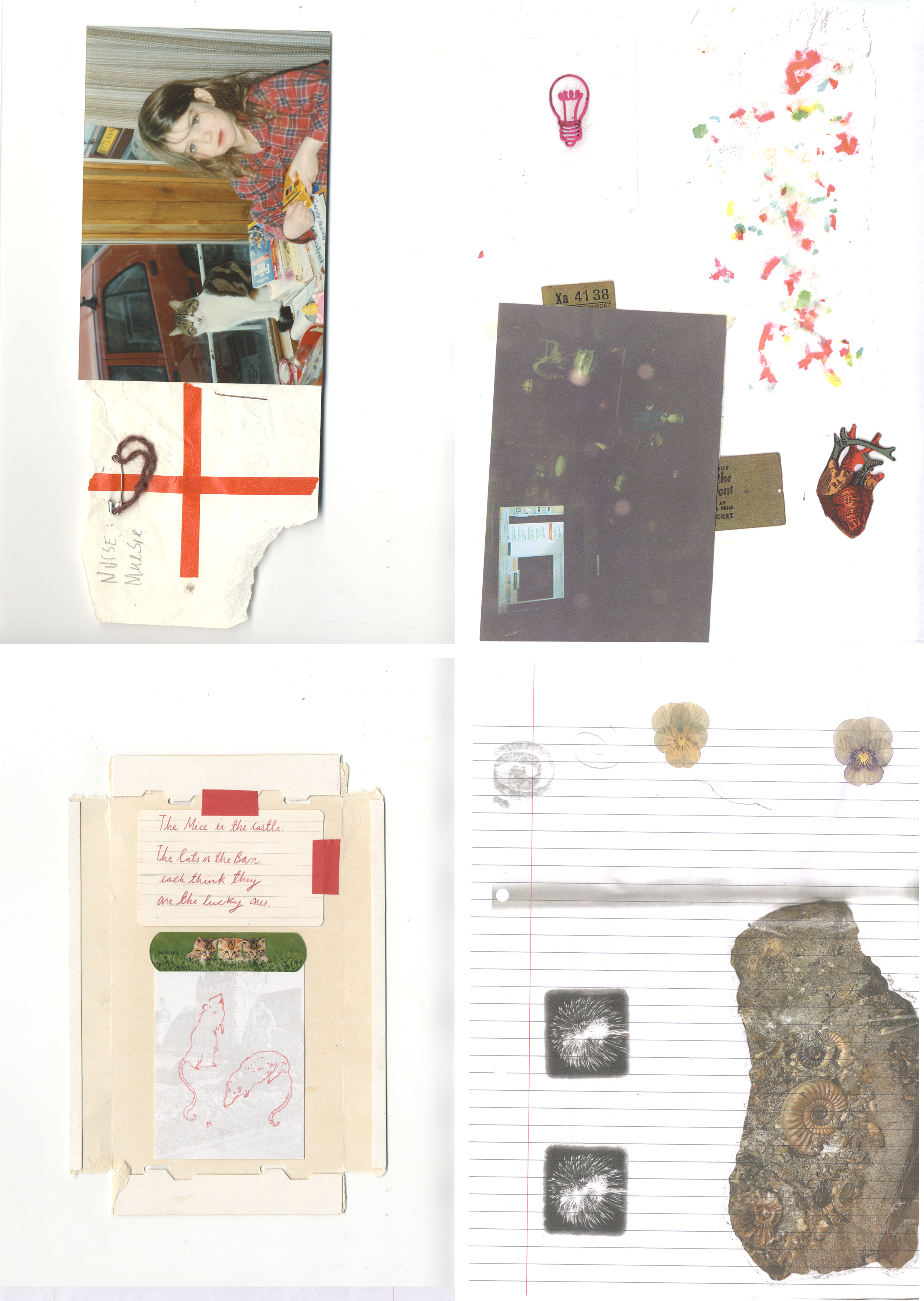 sugar paper, watercolour, found scrapbook, photocopies, digital prints, colouring pencil, ink, coloured card, mod-podge gloss.