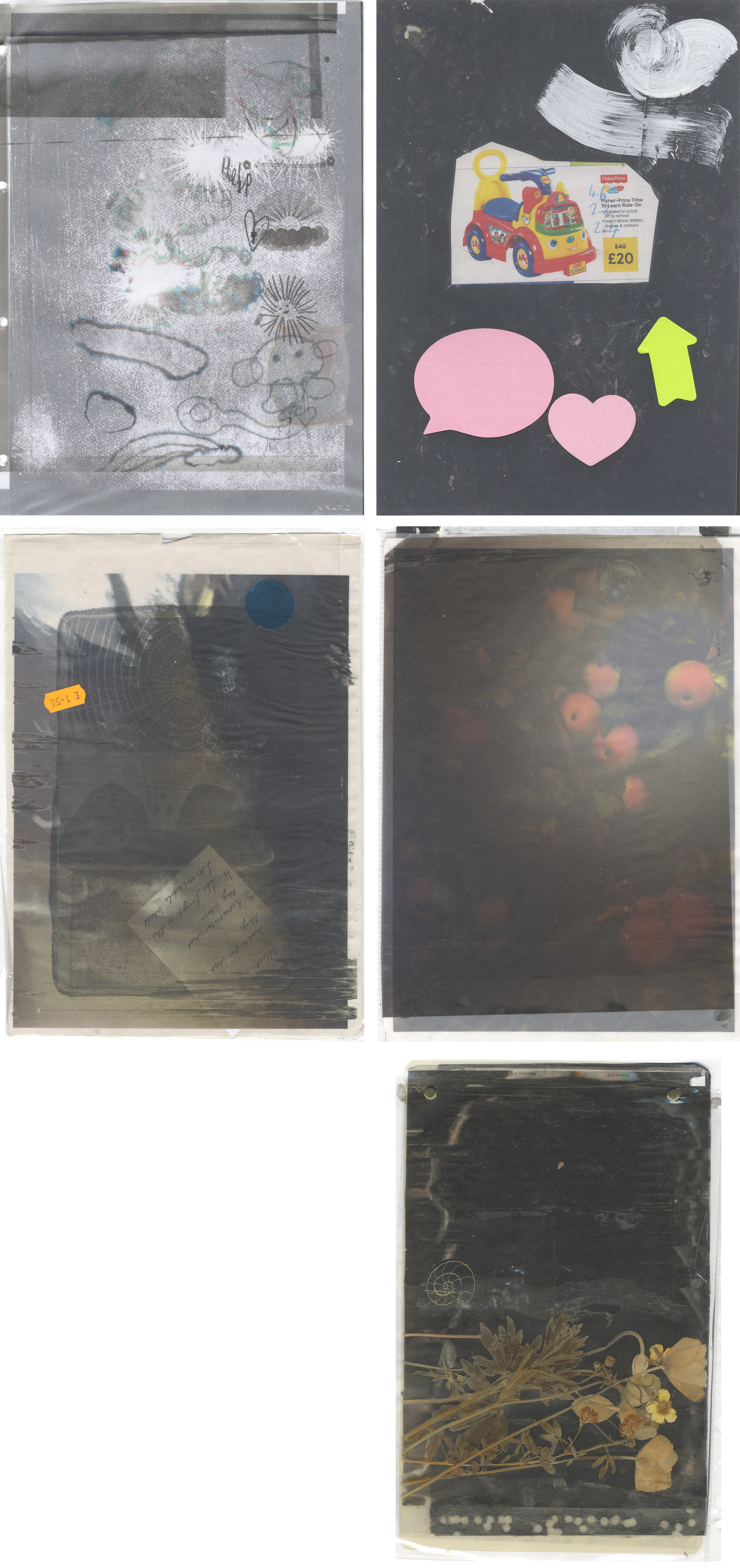 selected collection of failed drawings, photocopies, digital prints, monoprints, acetate prints, stickers, slightly damaged art materials, junk mail, catalog images collaged together