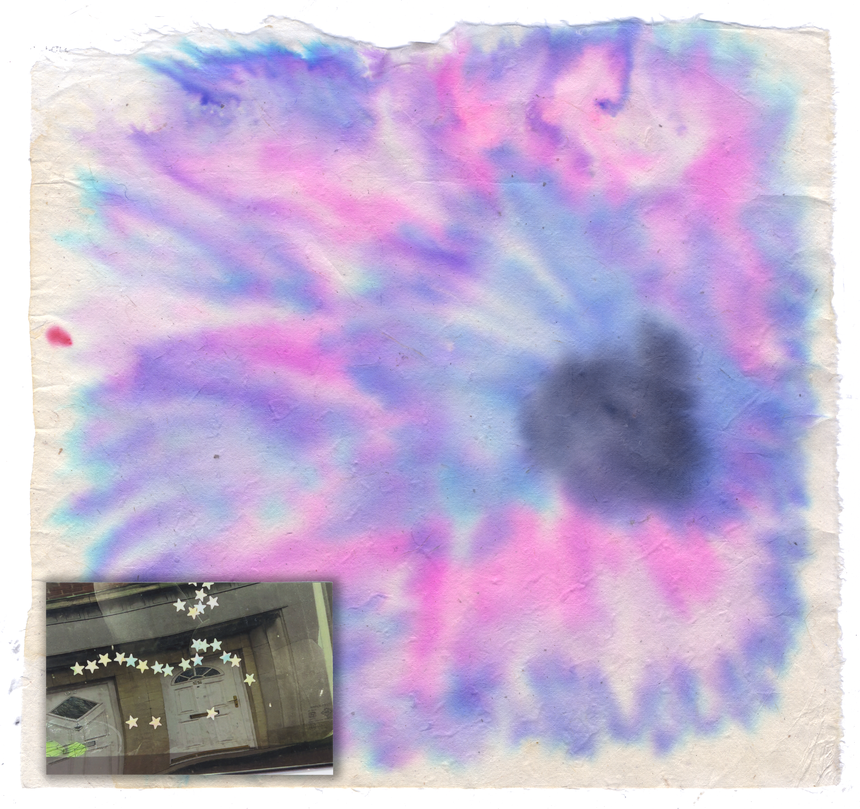 cotton rag paper, office stickers, acrylic ink, spilt brush washing water, water soluble pigment crystals