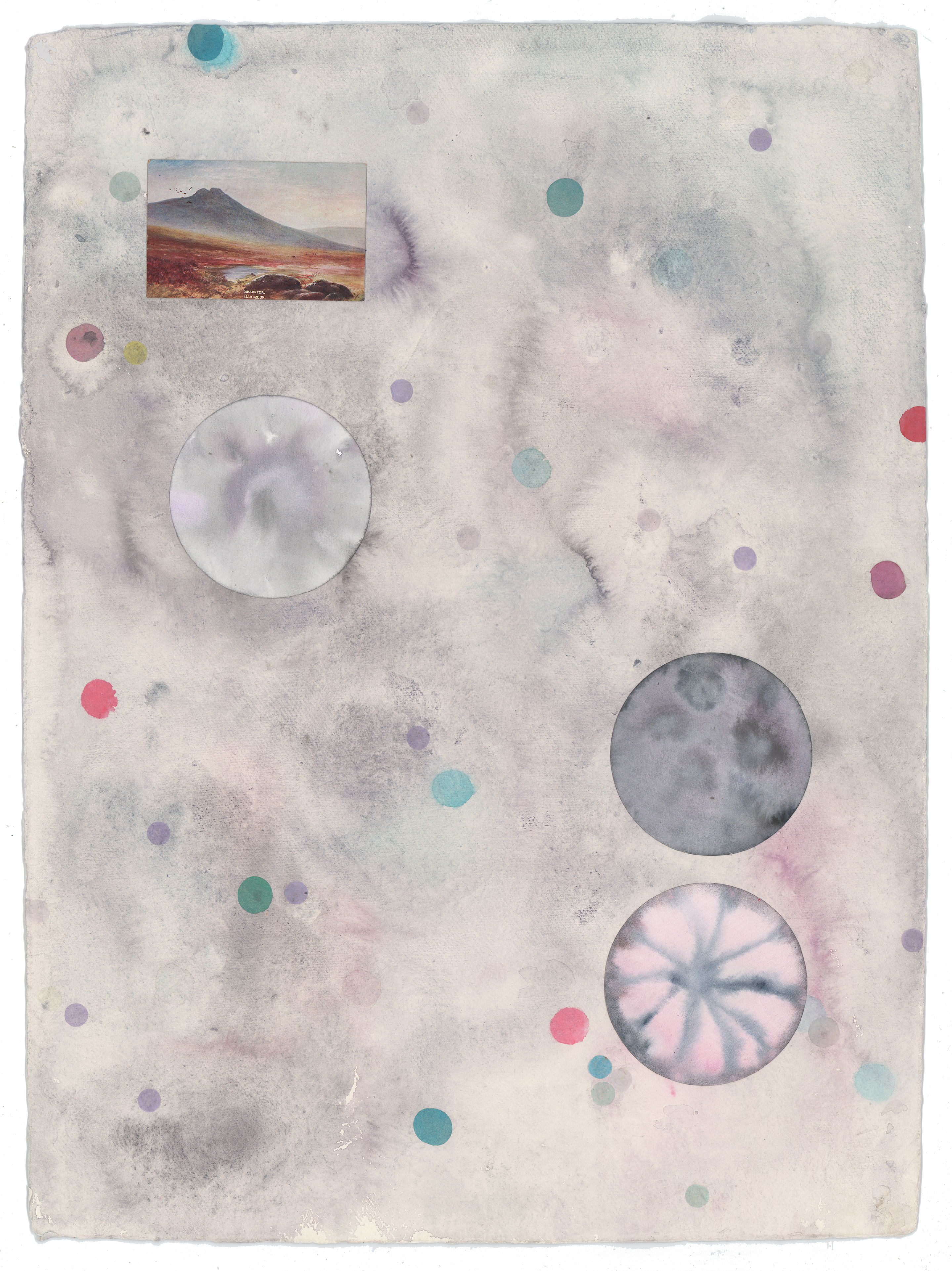 watercolor, ink and water activated pigment crystals with monoprint on colored paper