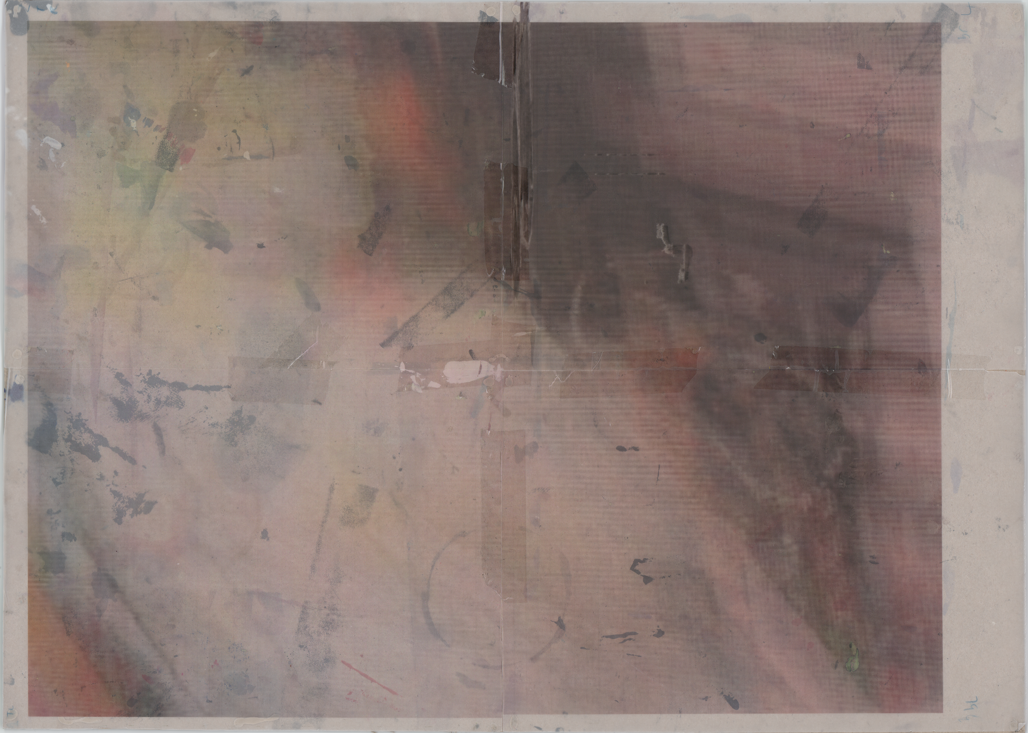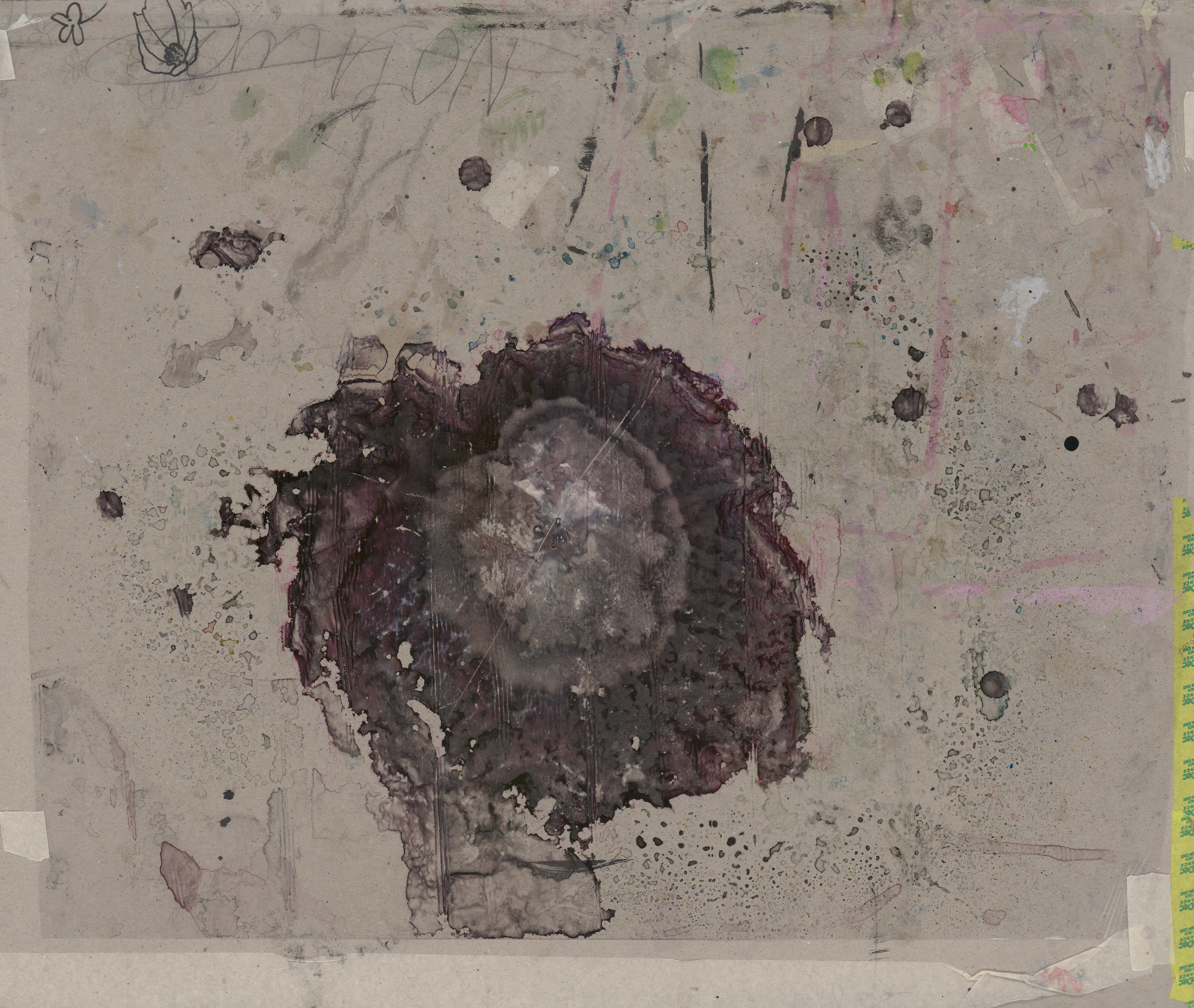 inkjet print on tracing paper, sellotape, acrylic ink, gansai tambi watercolour, corrections fluid on cellophane, over greyboard formally used as desk cover