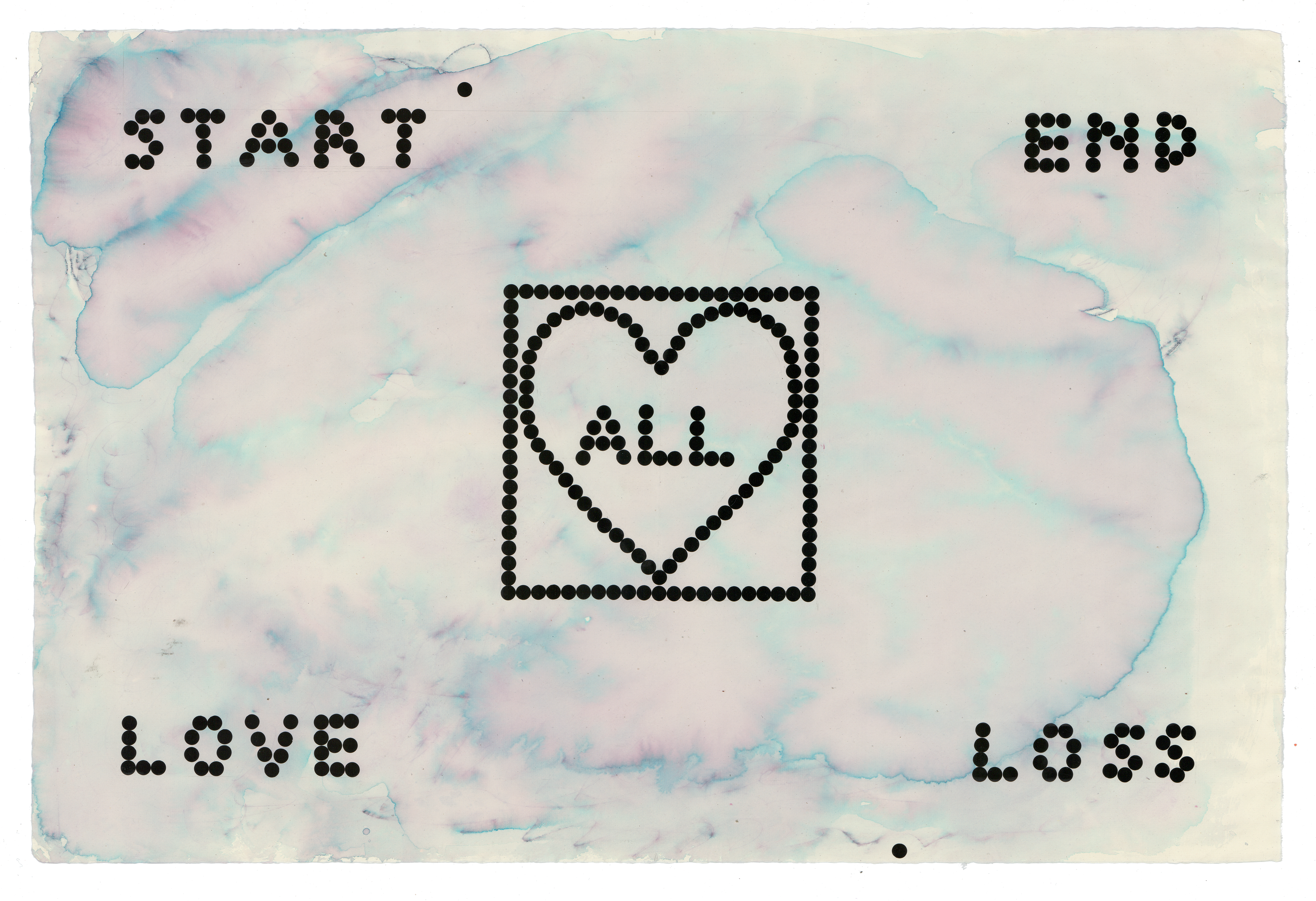 monoprint, chromagraphically processced black handwriting pen and office stickers on cotton rag paper