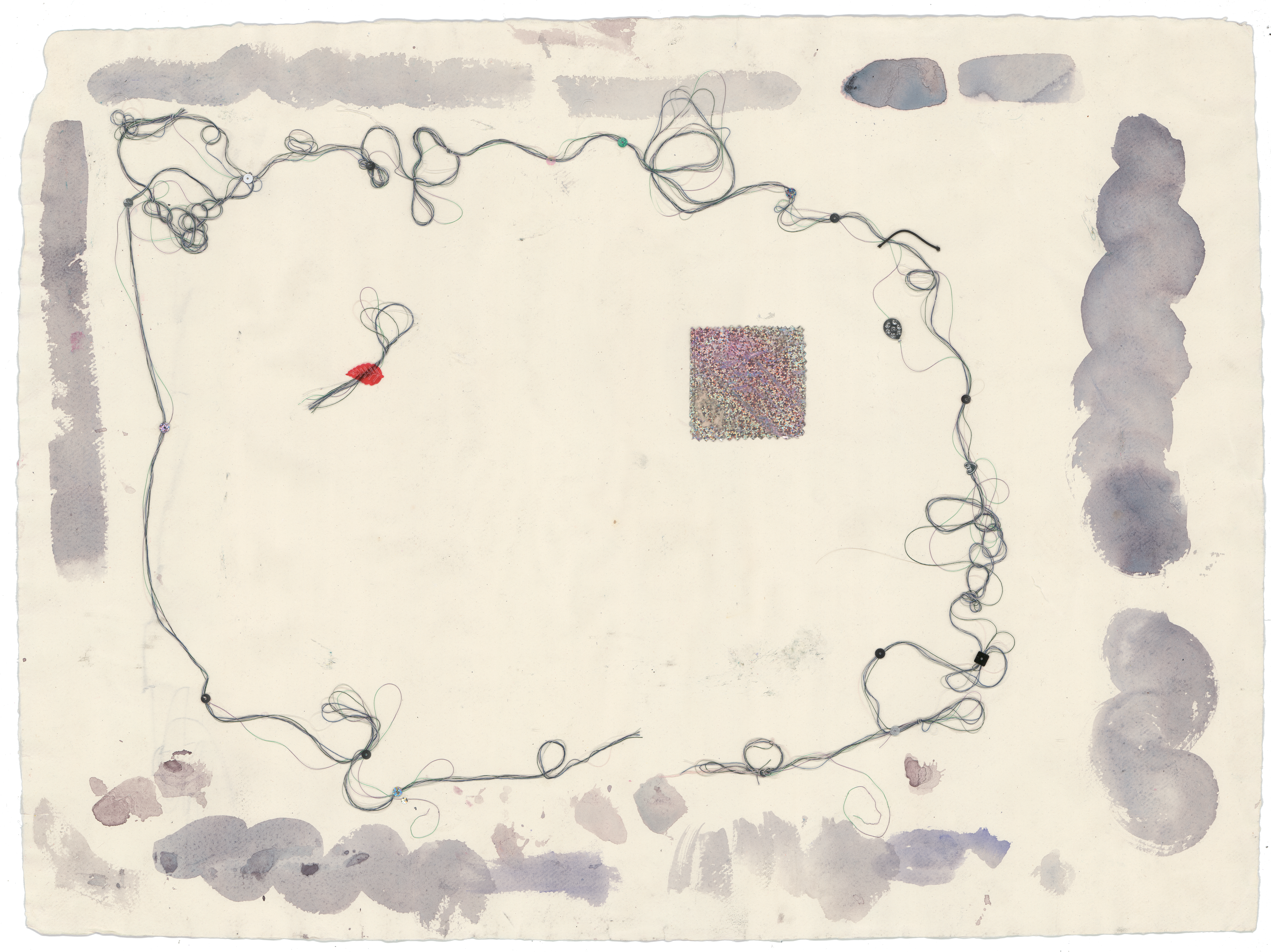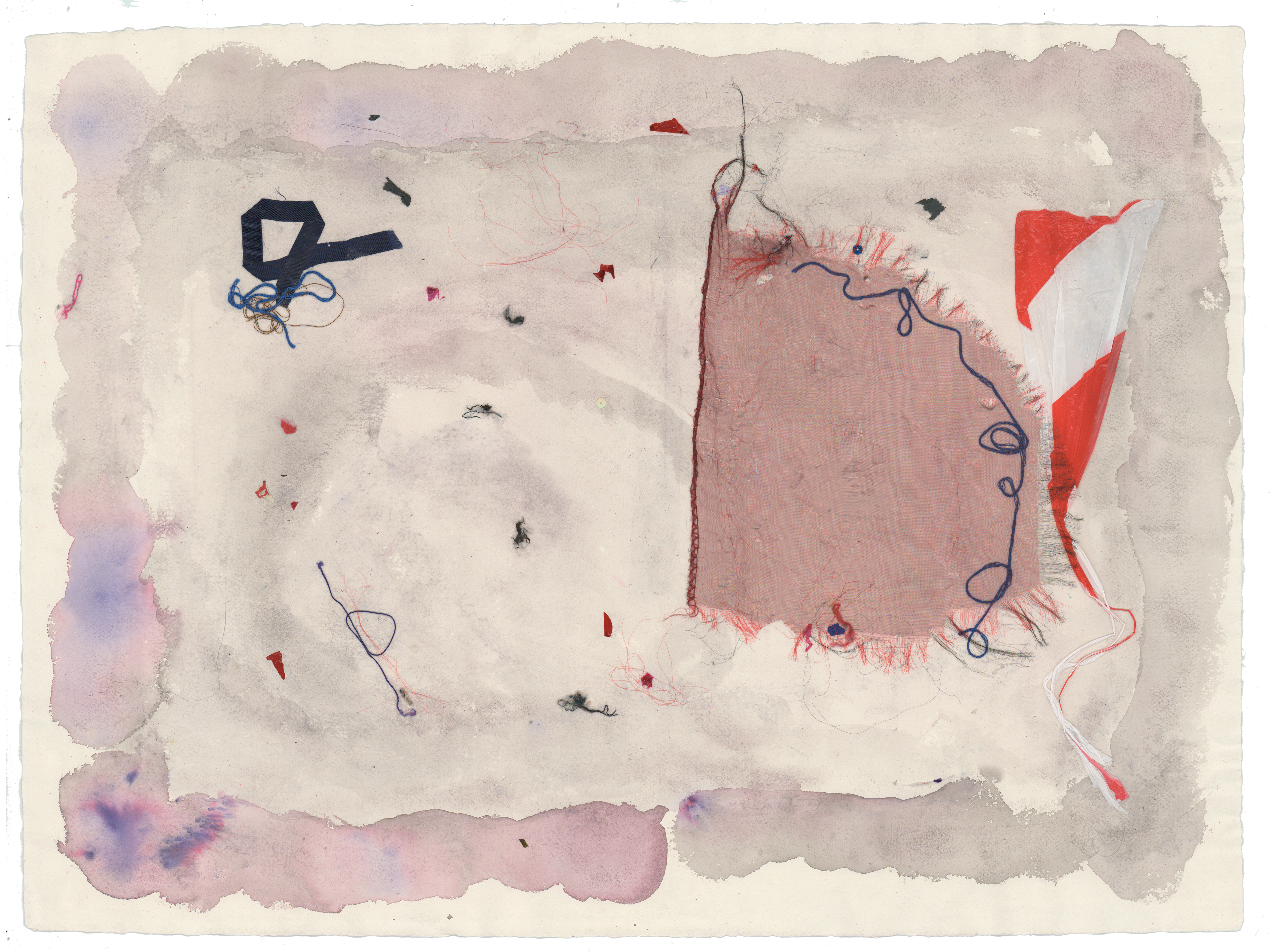 polyester sewing thread, ribbon, embroidery thread, fabric scraps, quality street cellophane, found barrier tape, organza scrap, sequin, holographic foil, gansai tambi watercolour and pigment on handmade cotton rag paper
